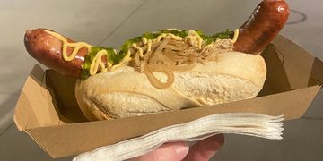 A delicious traditional Red Frankfurt served in a freshly baked roll, topped with either tomato, barbecue sauce, or mild mustard.
